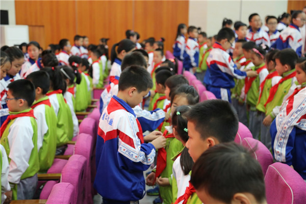 五年级的优秀少先队员代表为新少先队员佩戴红领巾