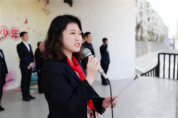 小学部青年教师组成国旗仪仗方队,朝气蓬勃。每位青年教师胸前都佩带着火红的团徽,神色庄严。小学部全体同学们,胸前的红领巾在春风中左右飘荡,如跳跃的红色火焰燃遍整个校园,孩子们的目光中充满敬佩和向往。升旗仪式由少先队大队辅导员韩梦蒙老师主持。