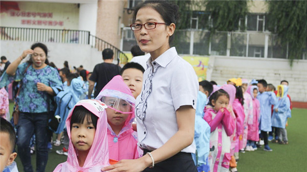 副班主任和临时副班主任两位老师手拿班牌在操场引导,班主任老师对每一位报道的学生和家长做认真的记录。他们用热情的微笑迎接每一张期待的面孔,回应着孩子们热情的问好。