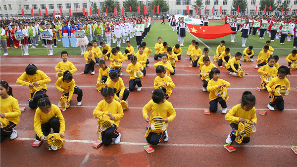 一年级的同学们手戴彩环,齐跳《上学歌》。他们天真无邪,童稚十足,虽然刚刚入校一个月,却早已融入了省二温暖的大家庭,用童真书写灿烂。