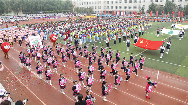 二年级425名同学手拿闪耀的花球,踏着动感的节拍,炫动他们的激情,绽放他们的笑脸。他们为盛会带来勃勃生机,为健儿们呐喊助威,更为成长加油喝彩!