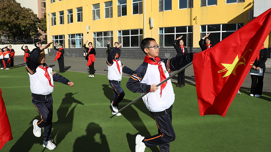 大队辅导员丁萌老师带领队员呼号,坚定的呼号声在校园的上空久久回荡。他们的呼号声表达了为实现崇高理想而不懈奋斗的决心。