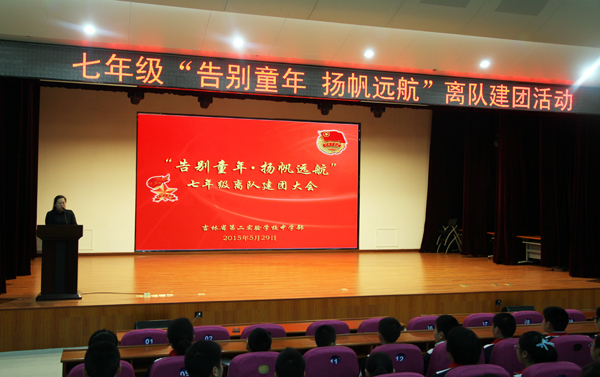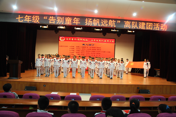 5月29日,中学部七年级全体师生相聚一堂,在报告厅举行了以“告别童年˙扬帆远航”为主题的离队建团仪式。仪式共分“摘下红领巾,告别童年”、“加入团组织,扬帆远航”两个篇章。出席活动的领导有中学教导处张连峰主任、七年级年级组长郭天景老师。